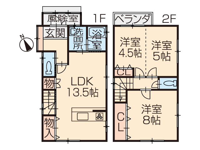 | 間取内容 | 1階LDK13.5畳 2階洋室8畳 2階洋室9.5畳 2LDK(3LDK可) |